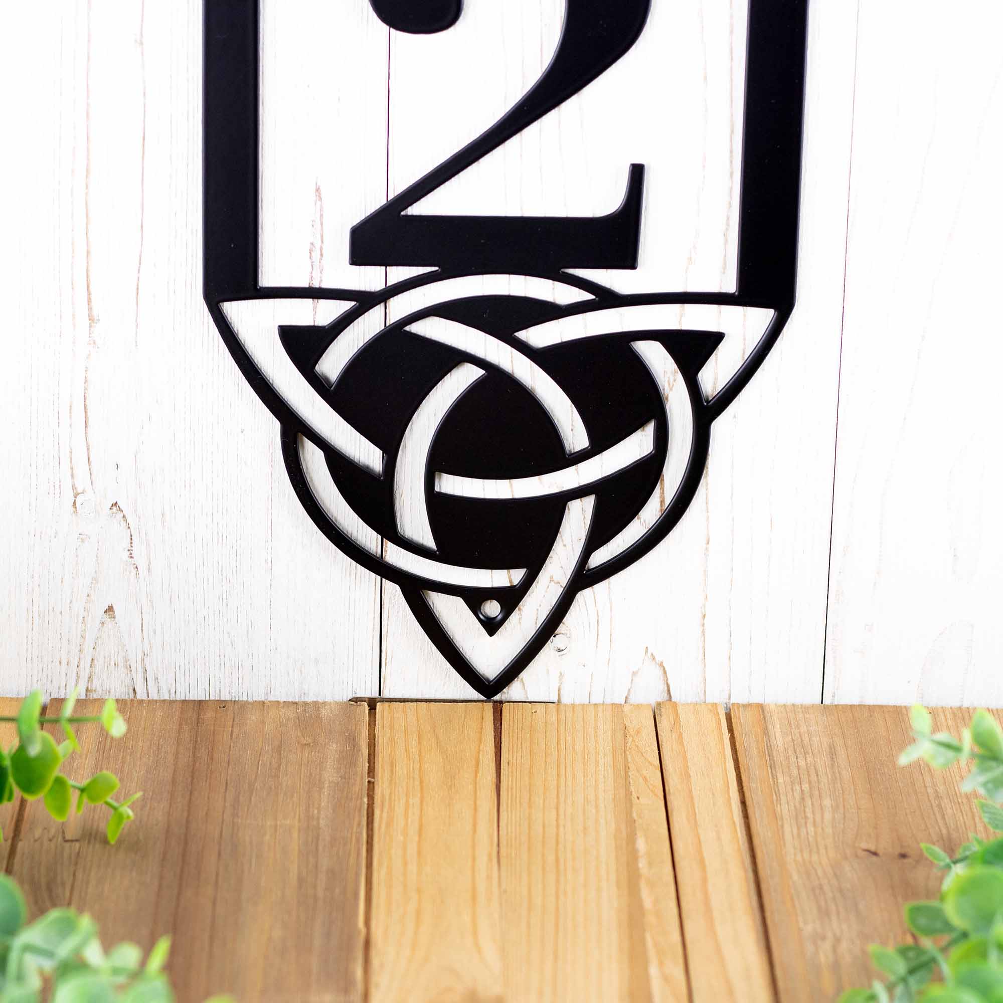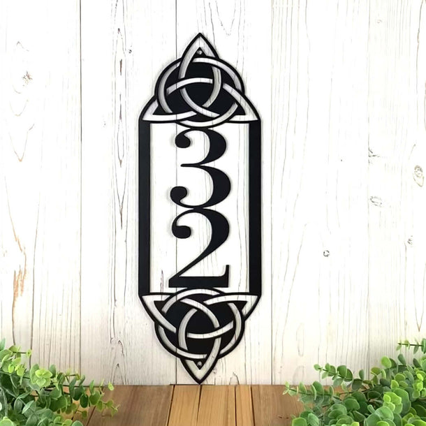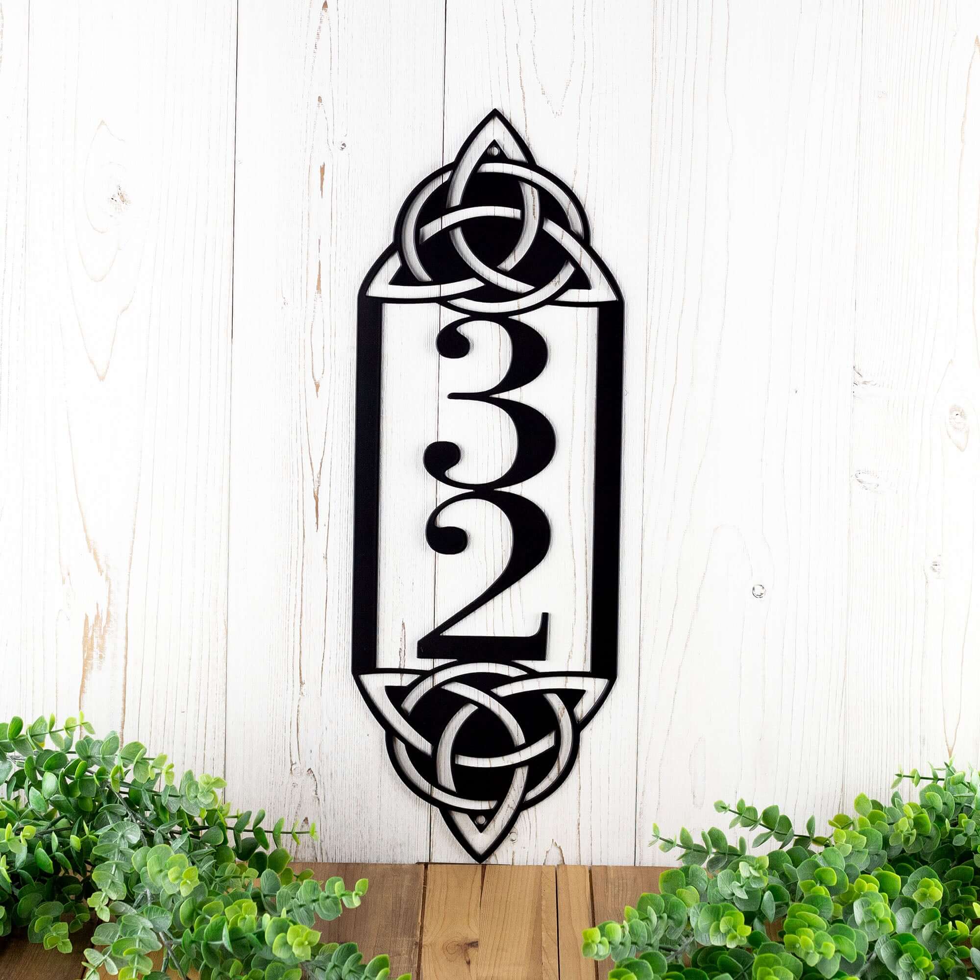 Add a unique touch to your home with this beautiful vertical house number metal sign featuring a Celtic knot design. Your sign is laser cut from premium quality 14 gauge steel and powder coated for a durable finish. You can also choose to leave your sign as raw steel (dark gray in color) and spray paint in the color of your choice or leave it to naturally rust. The sign is sure to bring a touch of old-world charm to your home and will be a great way to show off your style to visitors.