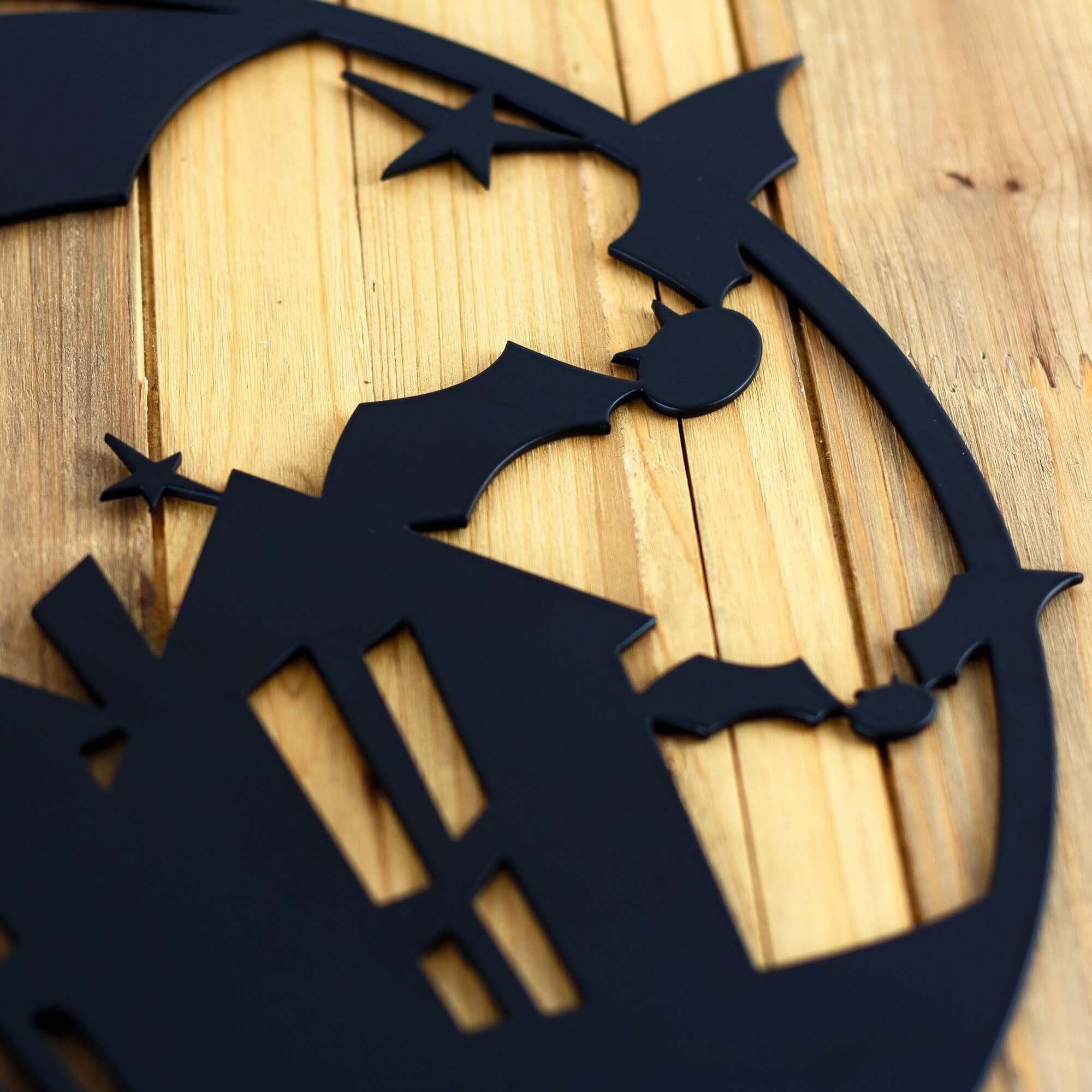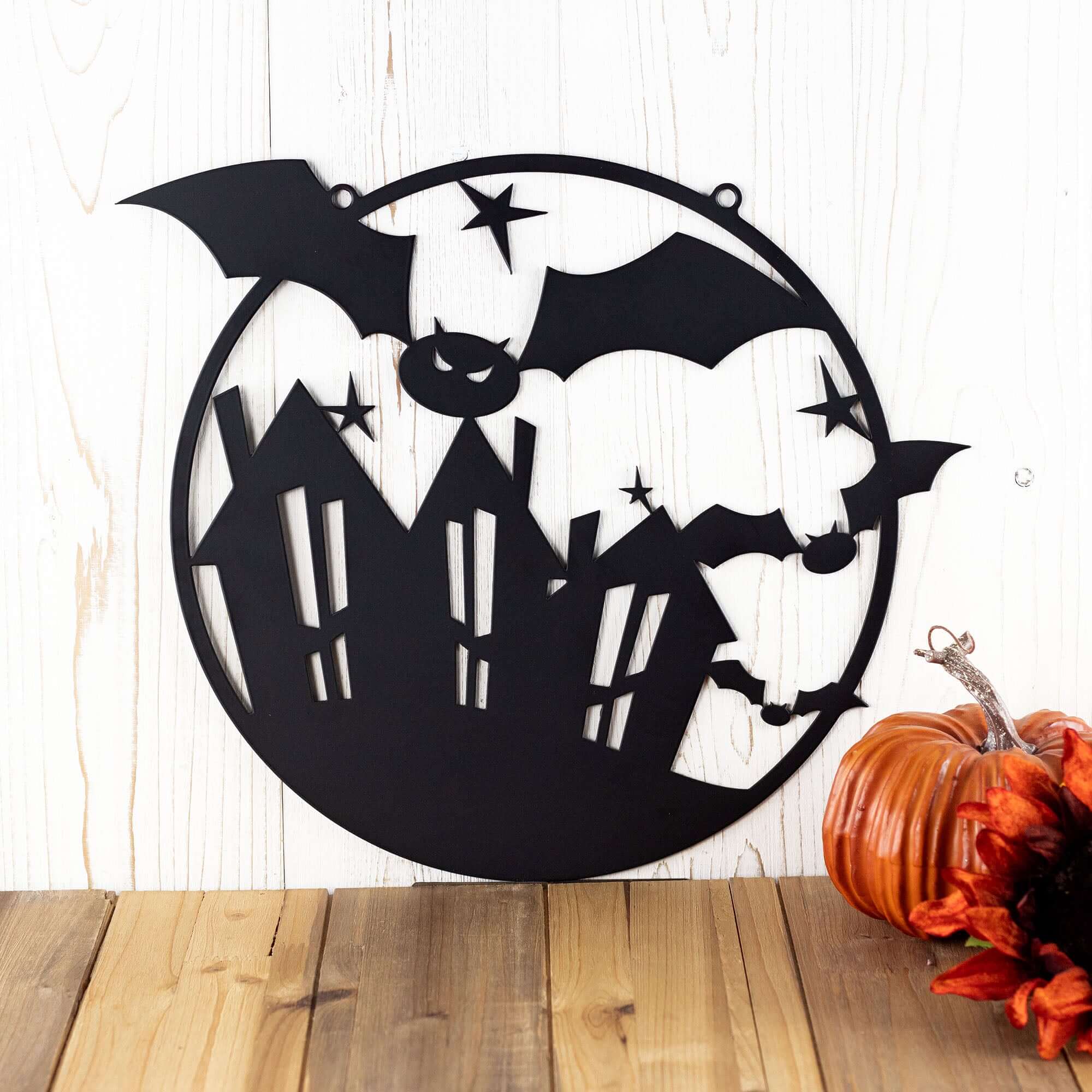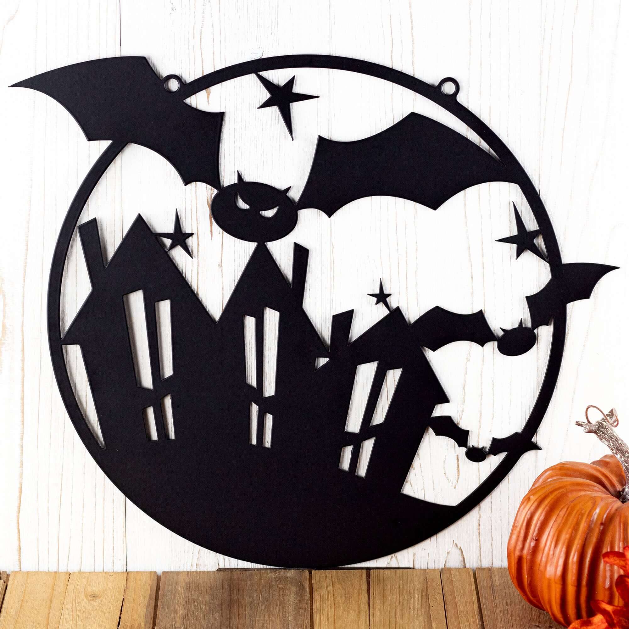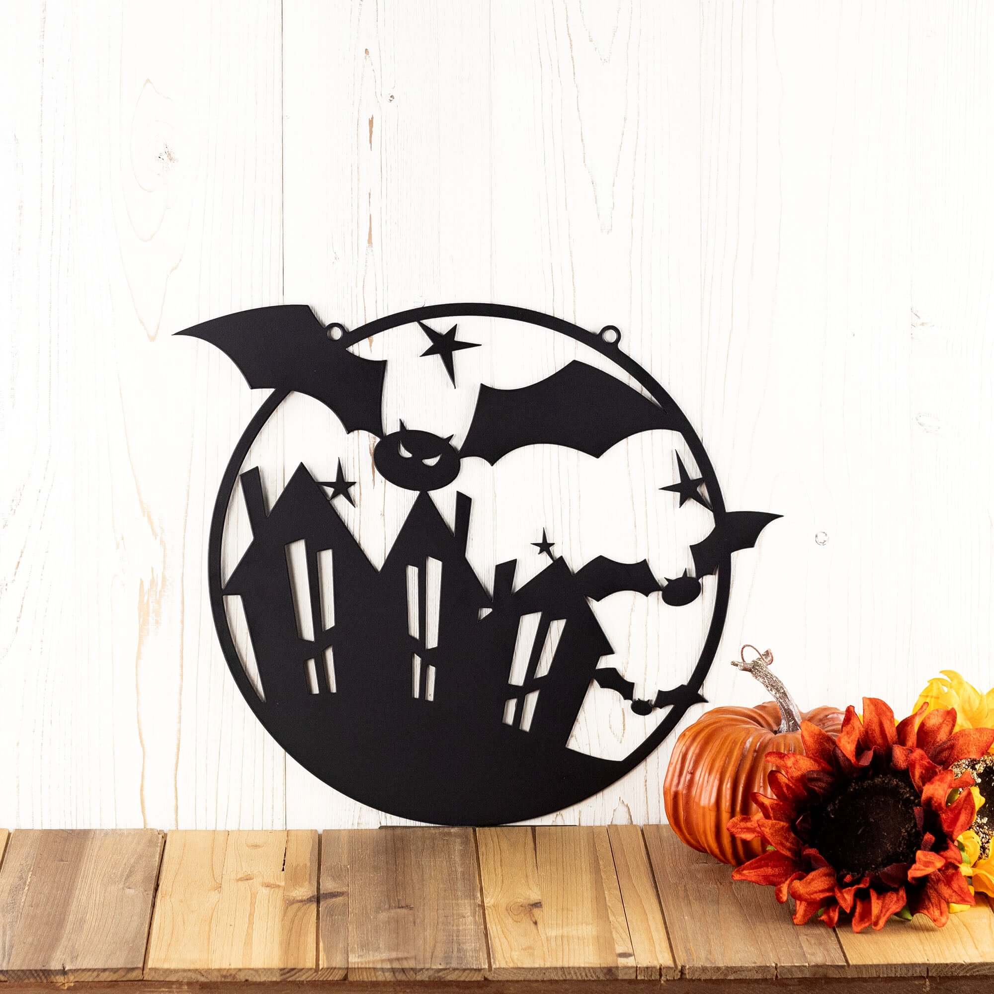 Add a spooky touch to your Halloween decor with this unique circular metal wall art! This piece features bats taking over the town. Your sign is laser cut from premium quality steel and powder coated for a durable finish. You can also choose to leave your sign as raw steel (dark gray in color) and spray paint in the color of your choice or leave it to naturally rust. this wall art is sure to make your Halloween decorations stand out from the rest.