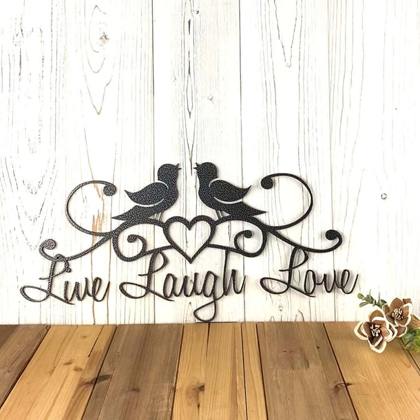 Looking for a unique and charming decoration for your home? Look no further than our Live Laugh Love metal sign! This sign features the words "Live Laugh Love" in a beautiful script font, with adorable birds perched on the letters and a heart accent for added charm. Your sign is laser cut from premium quality steel and powder coated for a durable finish. You can also choose to leave your sign as raw steel (dark gray in color) and spray paint in the color of your choice or leave it to naturally rust. Perfect for hanging in any room of your home, this sign is sure to inspire you to embrace the joys of life and fill your home with love and laughter.